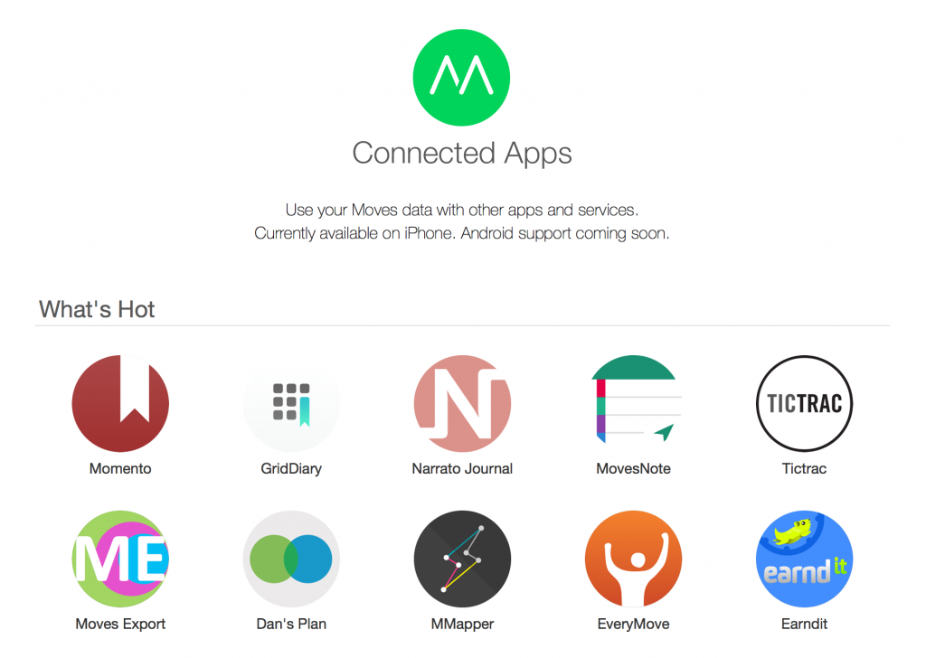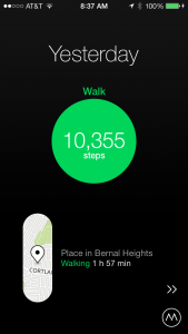 We’re pleased to announce that we have integrated with the smartphone app called Moves. This app can be downloaded for both iOS and Android phones. Once downloaded and configured, it works like a pedometer to collect your daily step count as you carry your phone with you across the day. Recently, Moves upgraded their product to Moves 2.0, which provides a very nice experience, consistent with the iOS7 flat design style. Here is a screenshot of my steps from yesterday: